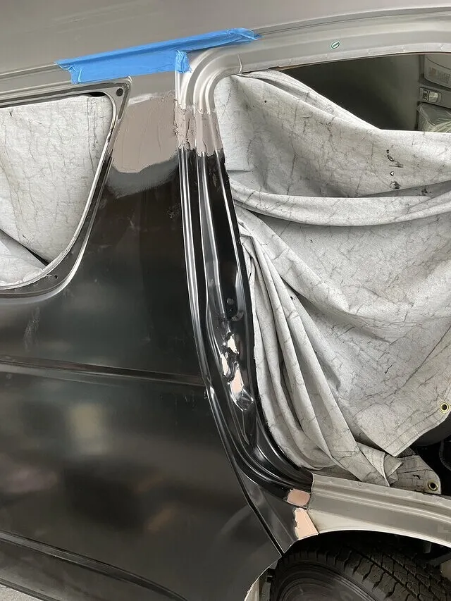 クオーターパネルをはがし新品パネルをパネルボンドと溶接で付けていきます。